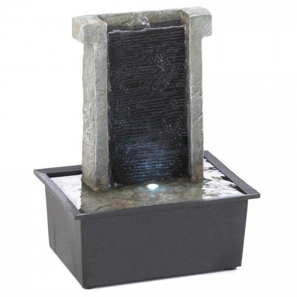 Serene stone tabletop fountain is made from durable polyresin and has a stone-like appearance. Includes an LED light for a stunning evening display. The calming water sounds and natural stone design will turn any space into a place of Zen. 2.2 pounds. 8.25 x 6 x 10.2 inches tall. Polyresin and LED light. Water capacity: 800 ml. Included LED bulb has two-year life and is not replaceable.