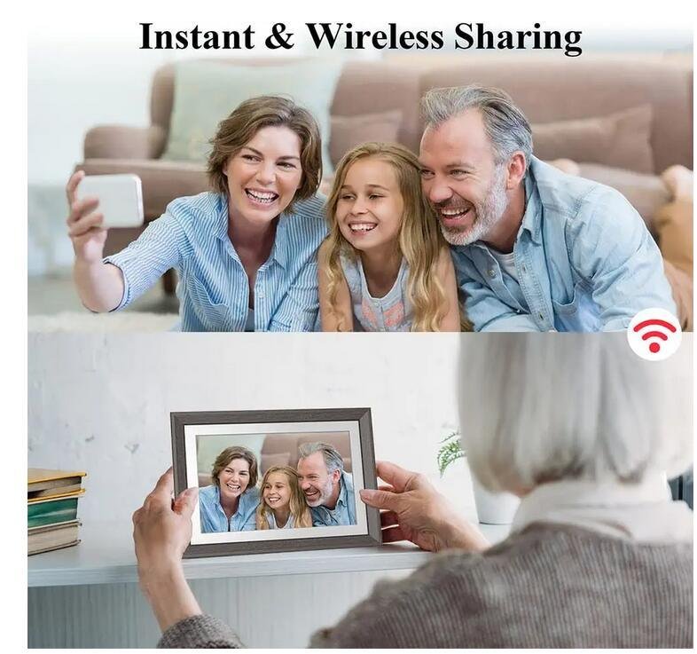 WiFi digital picture frame can automatically rotate photos to adjust the direction; and the border will be filled to blur the background. Enjoy your intact photos in full screen.When you are ready to send photos; you can also add fun captions and select the most important part of the photo.