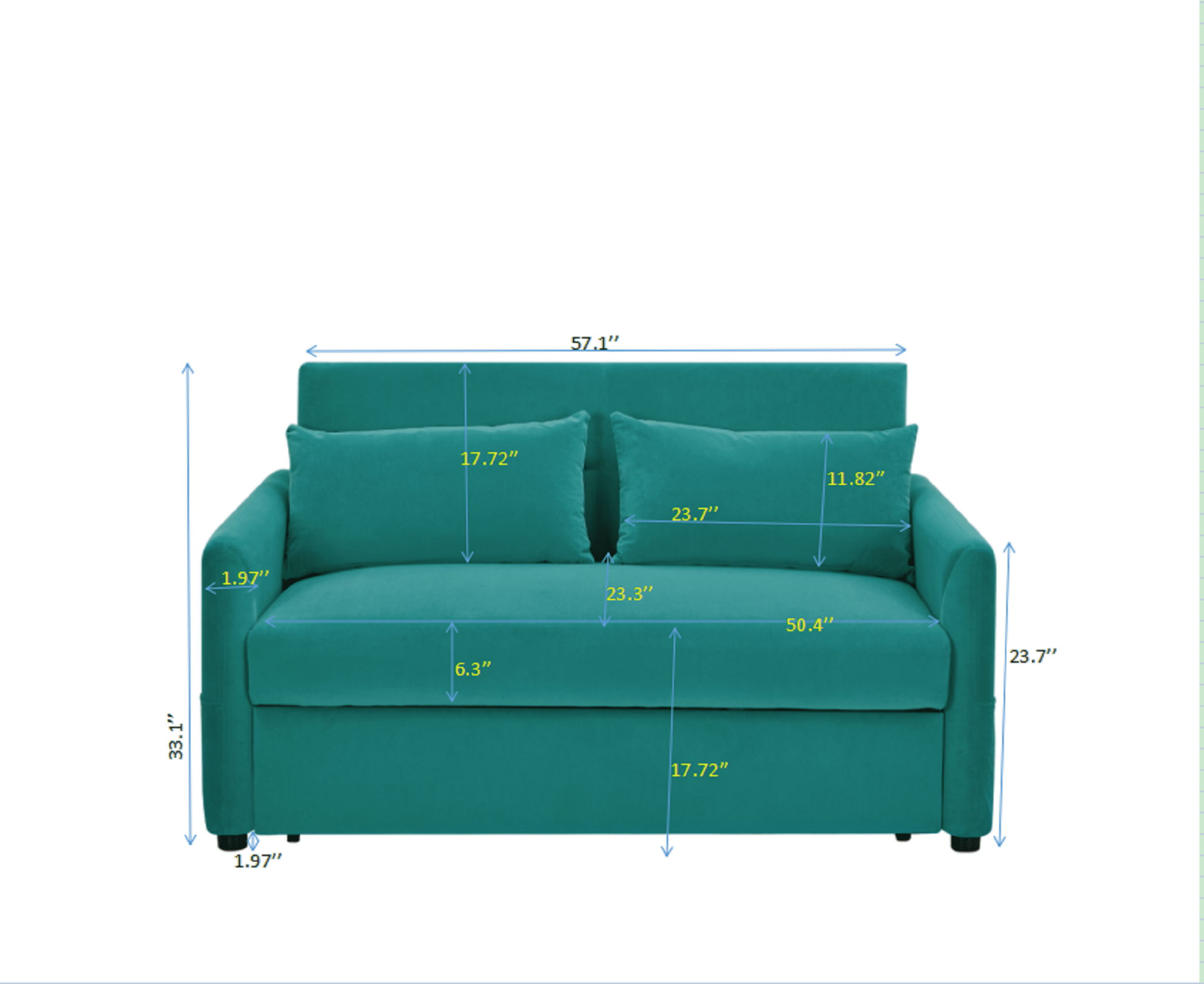 product description feature1: Convertible design: This multifunctional sofa chair bed can be easily and quickly converted into armchairs; visitor chairs and recliners. To meet your various needs; and no longer worry about unexpected visitors; let them have a comfortable bed to sleep in.2: Adjustable and convenient: The folding bed chair has a 3-level adjustable backrest; which can provide a comfortable sitting or lying experience. The convenient strap can be easily pulled out of the broaching part to form a bed.3: Comfortable fabric: The seat cushion filled with high elastic foam and polyester fiber filling can provide a comfortable filling structure; bringing extra comfort and longevity.4: It can be assembled with your friends; it takes about 40 minutes.Material:Fabric: Dutch velvet (velvet)Wooden frame: EucalyptusFeet: plastic rounded corners; metal rubber wheelsChair Product size: 57.1''*33.9''*33.1''Product size of broaching machine: 57.1''*69.3''*17.72''Product net weight: 126.73 poundsChair Packing size: 51.6''*44.1''*6.5'' Gross weight: 56 poundsBroaching machine packaging size: 50.4''*33.7''*13.8'' Gross weight: 90.4 poundsWeight bearing: 500lbs2 boxes/set