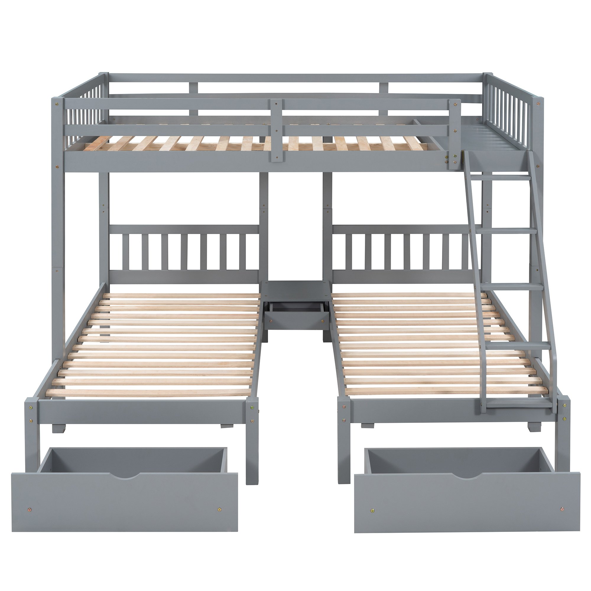 A perfect space-saving solution for multi-child families. A full bed combined with two twin beds, this triple bunk bed provides a convenient and flexible arrangement option for large families and sleepovers by taking advantage of vertical space. A gray finish enhances the smooth lines and add a contemporary feel to any room set aside for multiples to sleep. Crafted with pine wood and plywood, this triple bunk bed is sturdy and durable to withstand the test of time. The angled ladder allows you to easily access the upper bed. Sturdy guardrails protect you as you sleep through the night. Ample storage space is provided by the two large drawers under lower beds. This set works perfectly as a stacked full over twin & twin unit, or divided into three separate beds. You can choose the combination method based on your own needs.