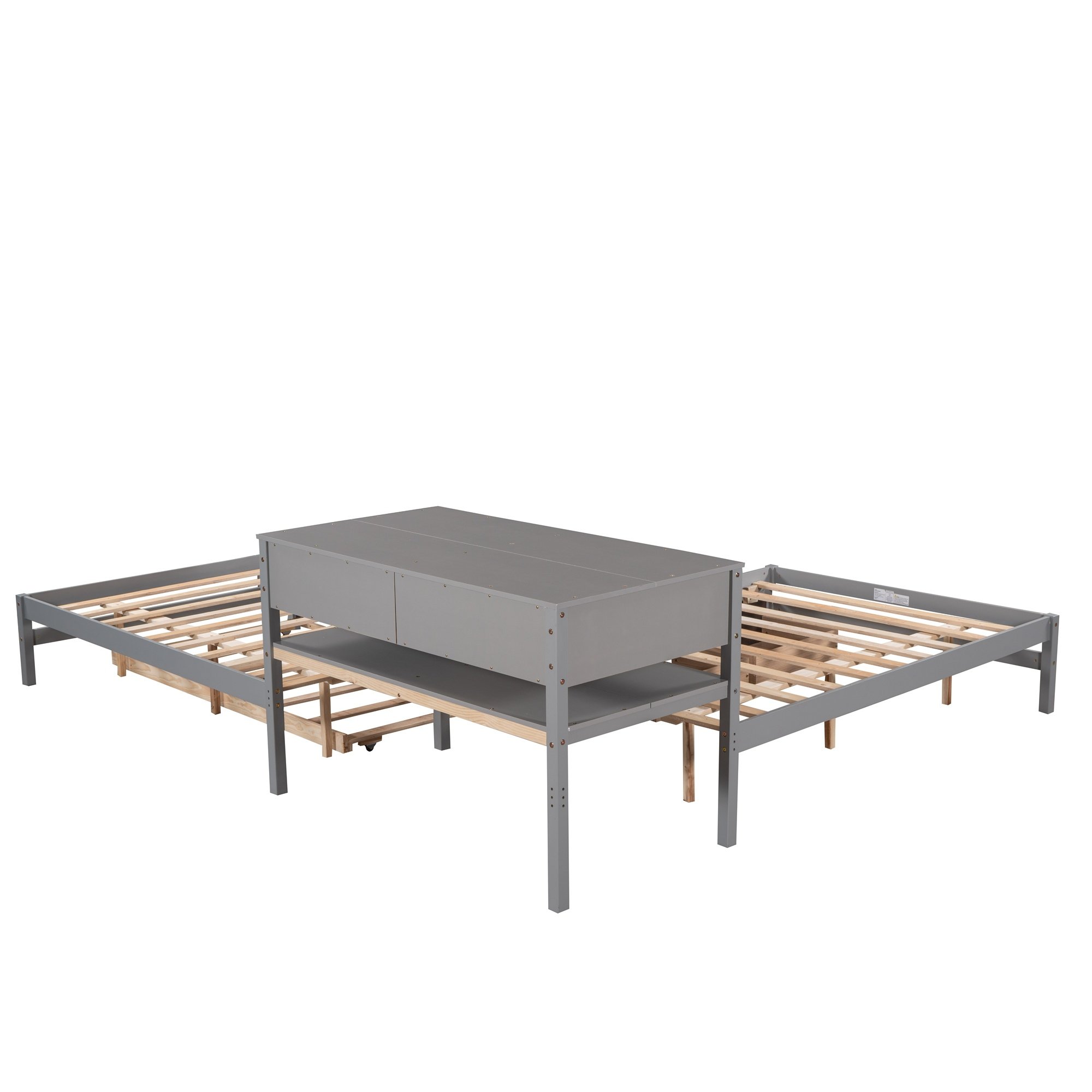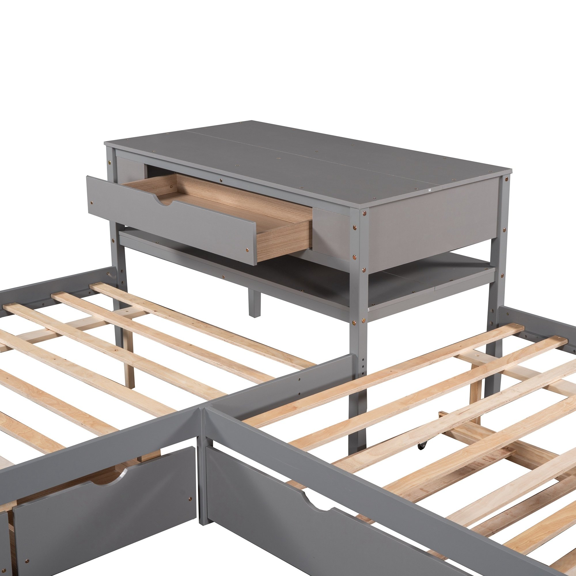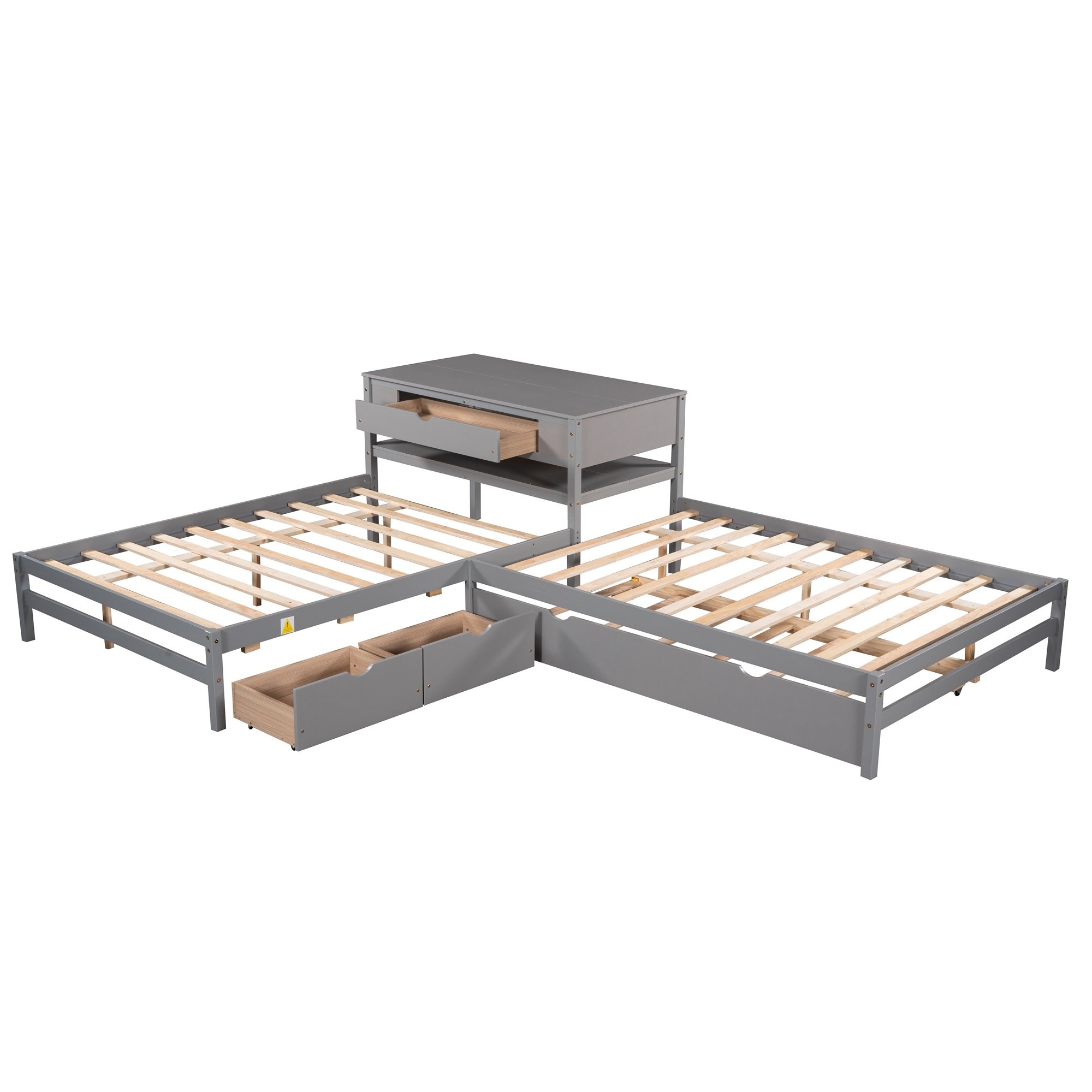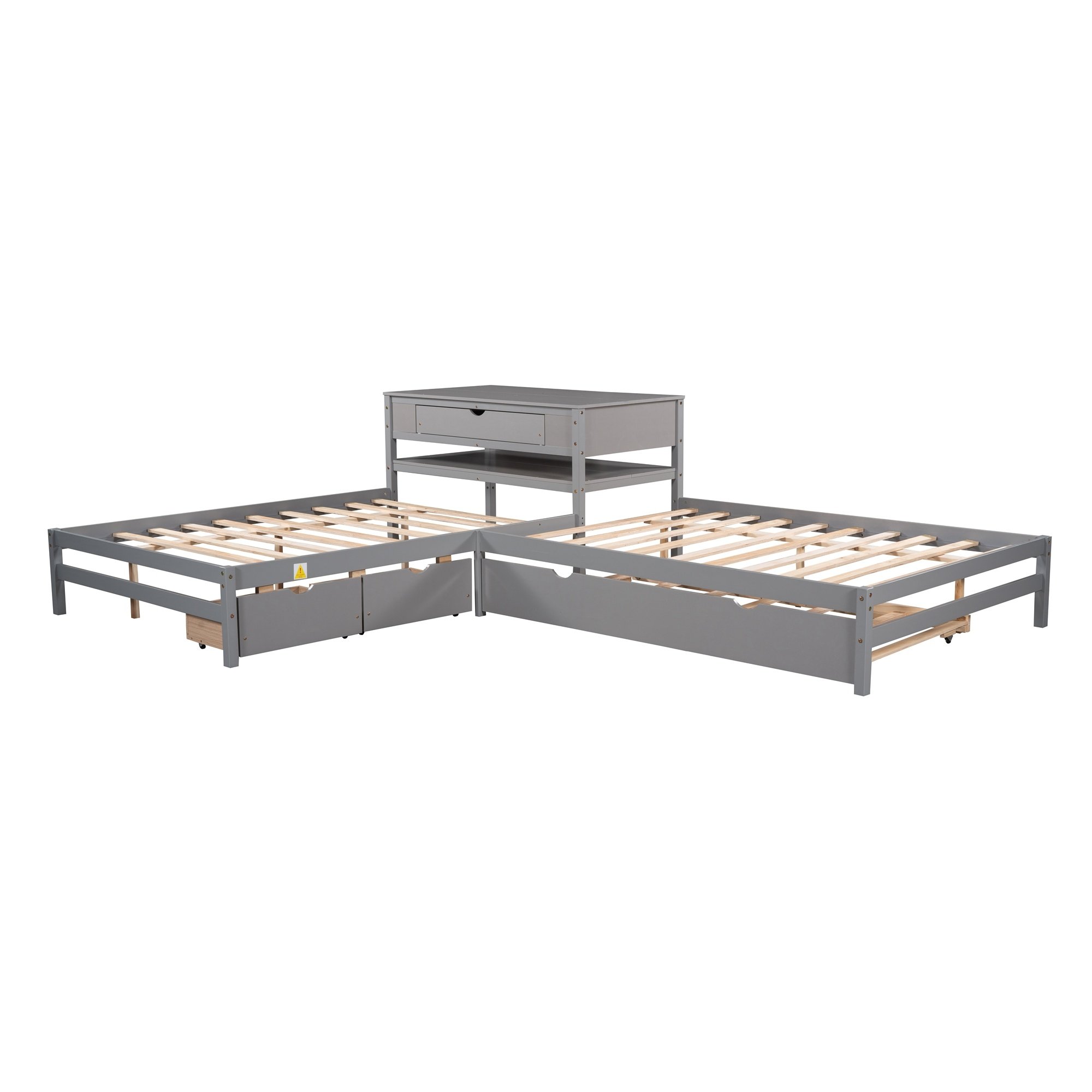This bed increased sleeping capacity is the perfect solution for cottages, extended family, out-of-town guests, or hosting your rambunctious friends for a sleepover. The unique L-shaped platform bed s offers a space-saving design which can accommodate 3 people.With a trundle and two drawers,especially the built-in table,which the table also includes a drawer and shelf,this special bed is configured to fit in the corner of the room. Two drawers under the bed are designed to store daily necessities like socks or clothes.Built-in rectangle table in the middle of these two twin beds offers both more durability and functionality which can be used as a nightstand.