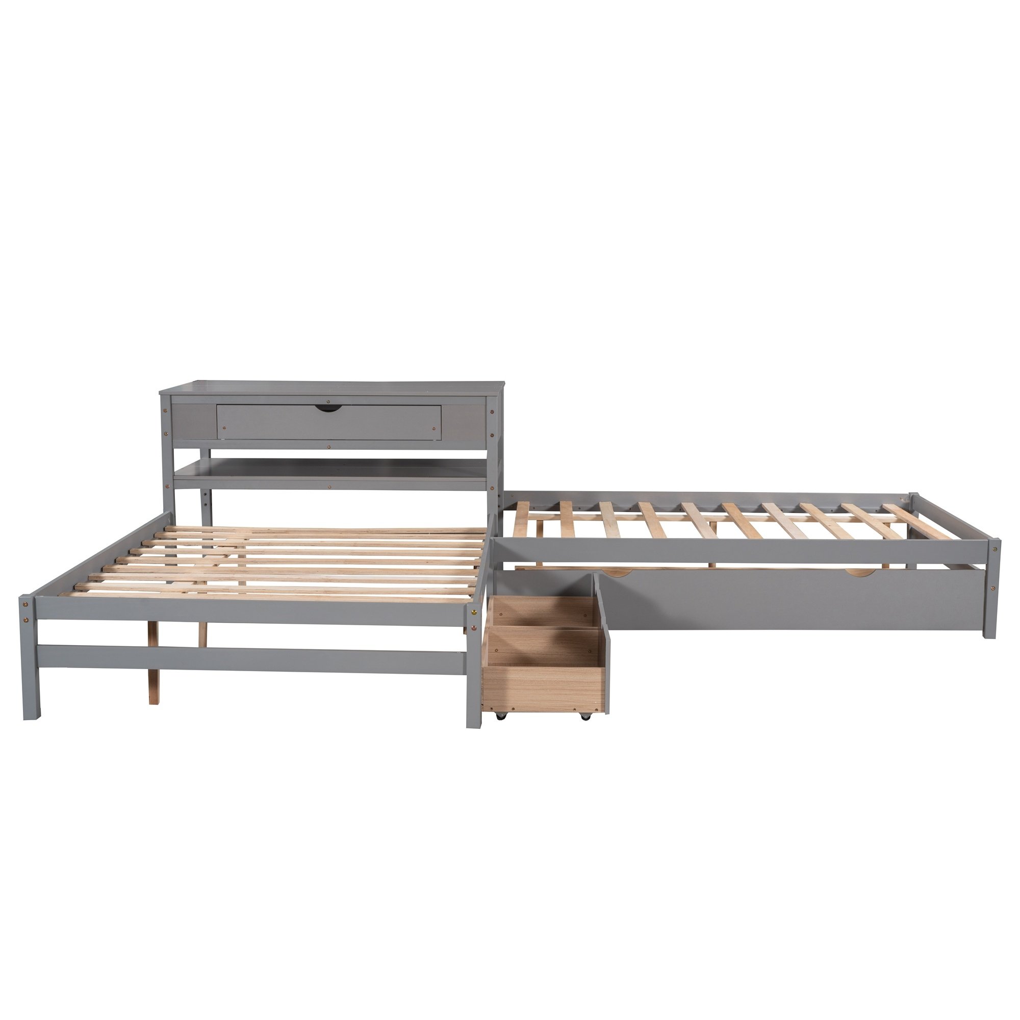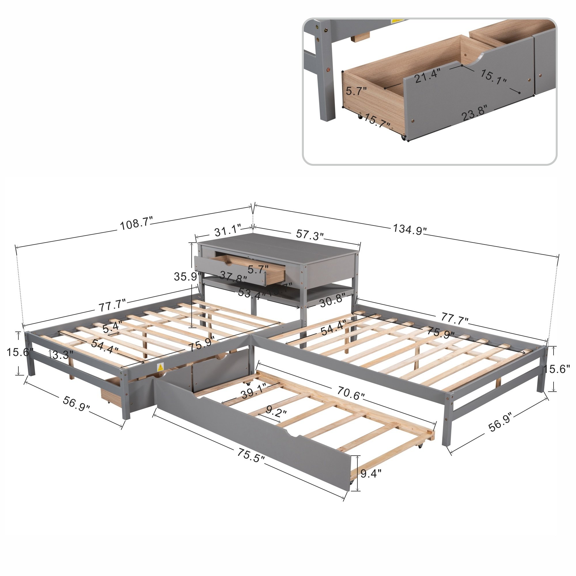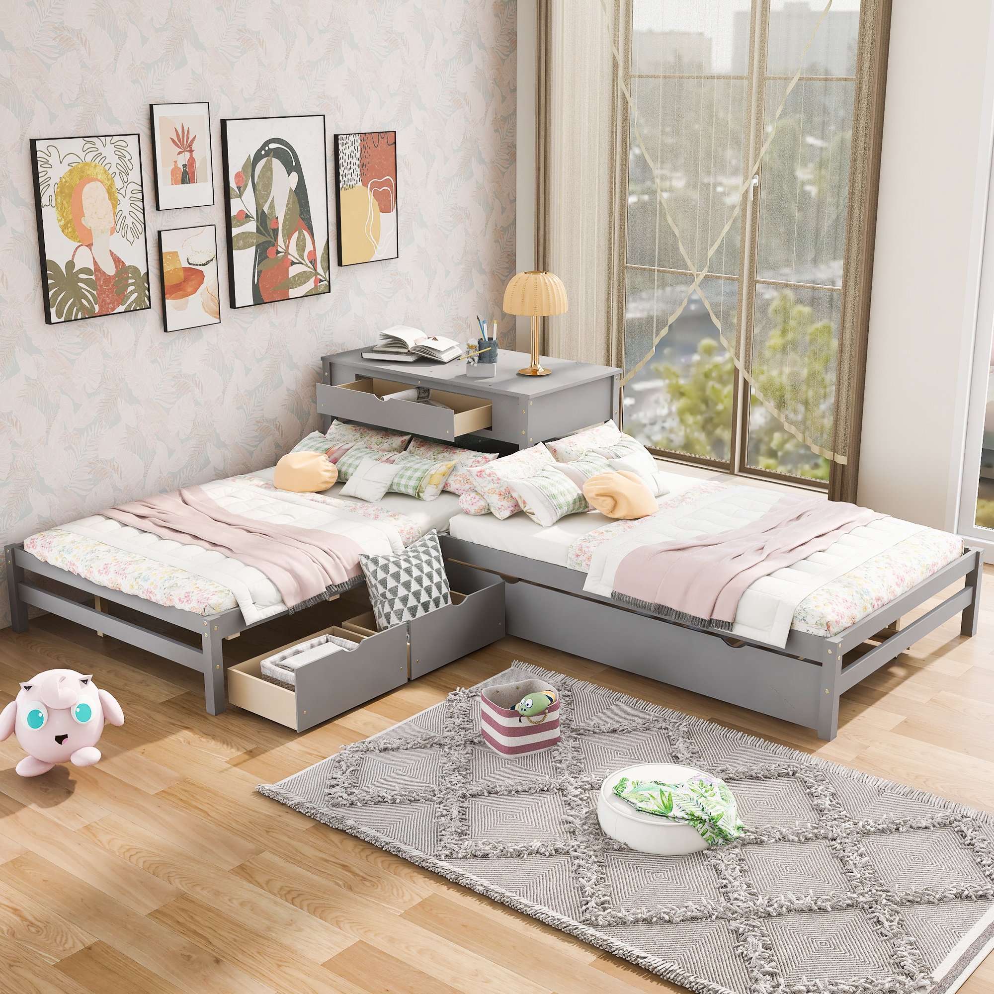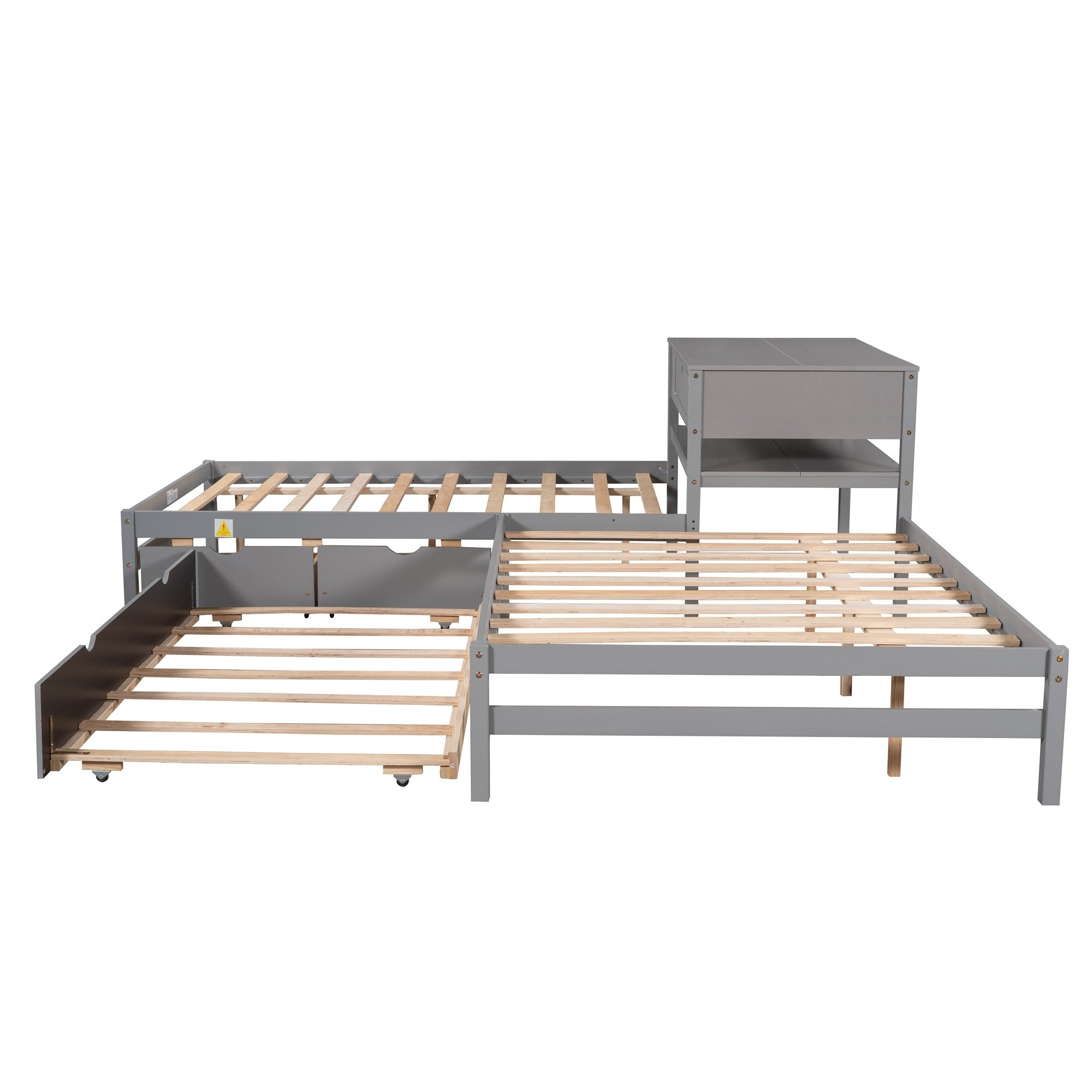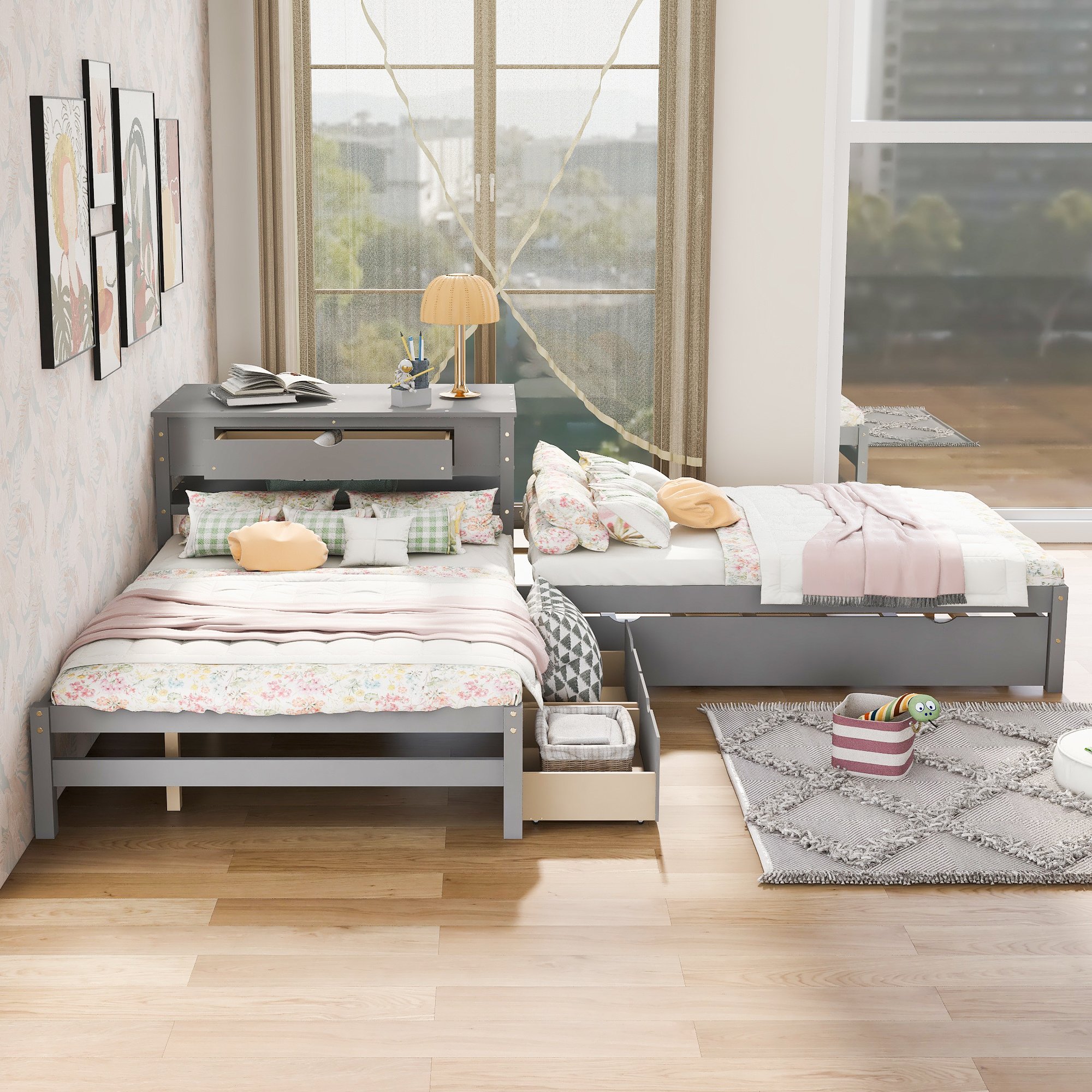 This bed increased sleeping capacity is the perfect solution for cottages, extended family, out-of-town guests, or hosting your rambunctious friends for a sleepover. The unique L-shaped platform bed s offers a space-saving design which can accommodate 3 people.With a trundle and two drawers,especially the built-in table,which the table also includes a drawer and shelf,this special bed is configured to fit in the corner of the room. Two drawers under the bed are designed to store daily necessities like socks or clothes.Built-in rectangle table in the middle of these two twin beds offers both more durability and functionality which can be used as a nightstand.