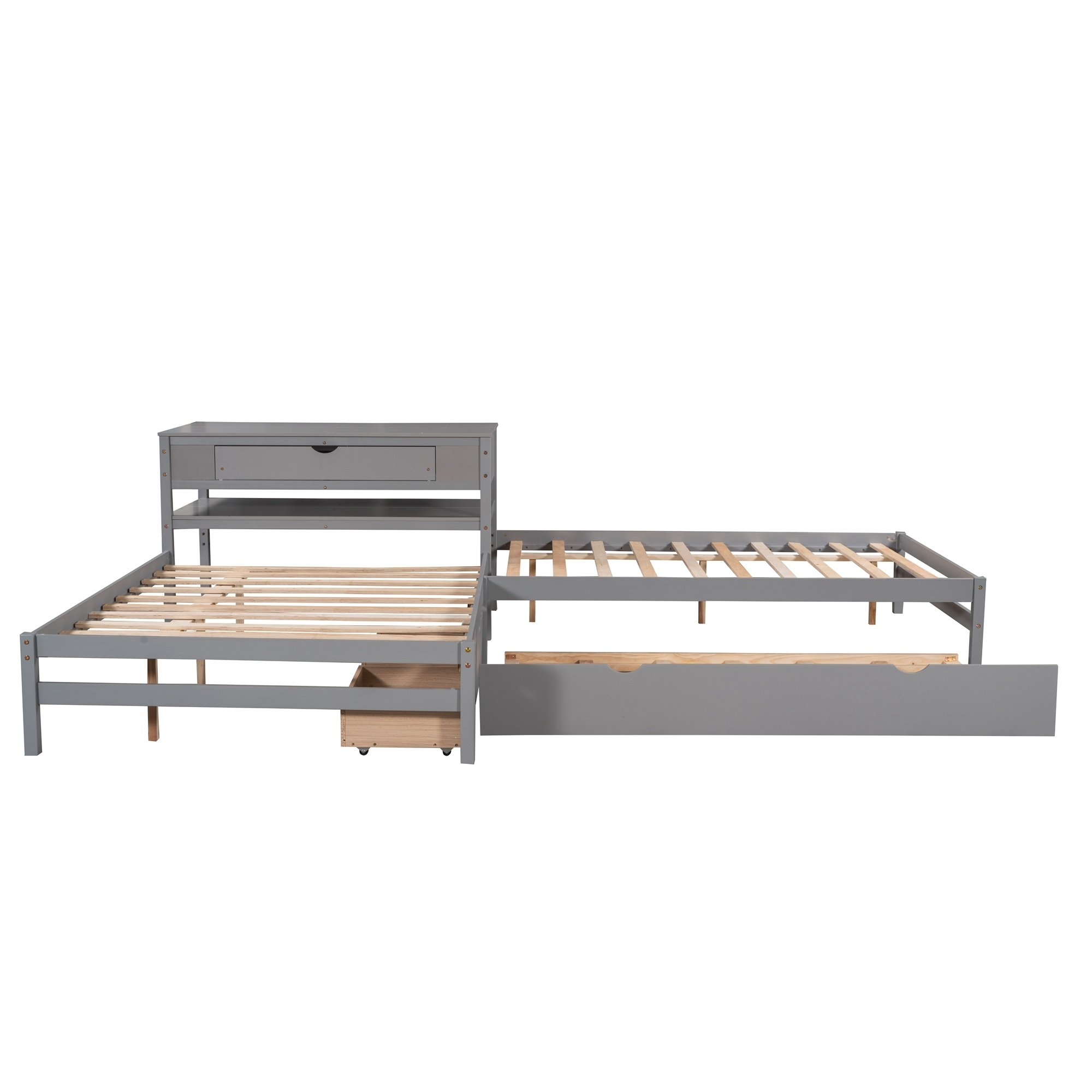 Full Size L-shaped Platform Beds with Twin Size Trundle and Drawers Linked with Built-in Rectangle Table