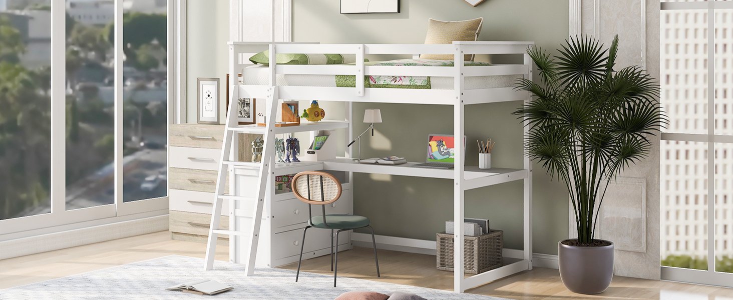 This twin size loft bed with desk and shelves and drawers is a minimalistic; stylish bed frame that works well with a variety of decorating styles and makes it easy for you to enhance and improve your space. Featuring strong; solid pine wood and sturdy supporting slats; this bed is built to last; ensuring it will accompany you for many years. What’s more; this product includes a desk; shelves and two large storage drawers in one.