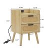 JHX Rattan nightstand with socket side table natural handmade rattan(2PC; Natural ; 15.55''W*13.78''D*23.82''H)IncludeNightstand*2Selling PointNatural handmade rattanNightstand table with outletsOctagonal rattan drawerSolid wood legsThe socket is placed on the back and is not easy to enter the waterDescription1.[2 More Convenient]:2 Rattan nightstand with outlets; plug your lamp or mobile phone on this narrow end table with 2 AC outlets and 2 USB ports; it will provide power at hand.And the socket is placed on the back to make it more difficult for water to enter.2.[Perfect Fusion of Classic and Modern]: The octagonal natural handmade rattan design on the surface of the drawer brings an irresistible charming bohemian vibe to your space; meanwhile; this rattan bedside table also provides your modern life Convenience; it's just what you need.3.[Perfectly blend into the room]: This bedside table with socket is also a small side table; 2 drawers with rattan finish and an open bookshelf are ready to welcome your books; water glasses; desk lamps and glasses; while the protective cover of the side table The sides keep your items from falling and give them a perfect place to rest.4.[Amazing Quality]: The four legs are made of solid wood; and the whole is made of solid P2 particle board; which is durable and stable; put this narrow side table at home and believe it will accompany you for many years.5.[Assembly is a piece of cake]: We provide complete and clear assembly instructions; you can enjoy the convenience of charging after the assembly is complete.Product InformationProduct Type:NightstandColor:NaturalMaterial:Solid wood+Particleboard + MDF+RattanProduct Dimensions:15.55''W*13.78''D*23.82''HDrawer inner Dimensions:Table top Weight Capacity:80LBSDrawer Weight Capacity: 25LBSCharging Power:120V/12ANumber of USB ports:2Power cord length: 6.5 ftAssembly Required:About 20minNotice:1. Due to lighting or monitor display; the color of the real product may be slightly different from the image.2. Manual measurements have been used and some reasonable errors may exist.3. The liquid should be blotted up with a damp cloth immediately to prevent the liquid from entering the socket.4. Hardware may loosen over time; check periodically to make sure all connections are tight.